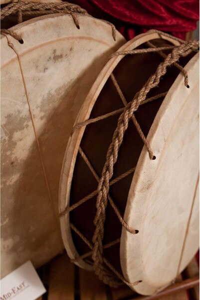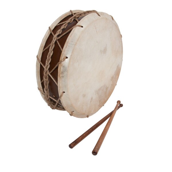 Two goat skin heads are tied to a wooden frame with thread rope. A thread snare is tied to one head. The Playing surface is about 11.5". The drum is about 4.5" deep. Each drum is shipped with a playing sticks. This is an historic reproduction designed by The Early Music Shop of Bradford, England. The English word "tabor" is derived from the Latin word for drum. Today we use the term tabor or refer to the two headed squat drums associated with the Fife and Drum. The thin shell of the tabor, looks like a frame drum shell with two heads. The shell is traditionally tin so the light weight instrument could be carried, and played, for long periods of time. The heads are usually rope tuned with a snare on one side. Players usually hang the drum from the forearm while using one stick to strike the snared head. The tabor is suspended by a strap from the forearm, somewhere between the elbow and wrist. They should never be played on a drum stand; which would muffle the sound. Today Tabors have a variety of names that reflect the cultures that play them as well as the different sizes of drum. Product weight:1.6#