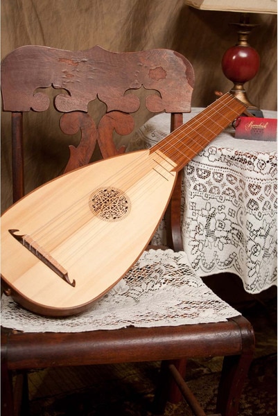 The sheesham travel lute has a body made of eleven solid sheesham staves, a sheesham neck and sheesham fingerboard. The peg box is solid sheesham attached at an angle of 135 degrees to reduce the depth of the instrument. The tuning pegs and end pin are sheesham. The soundboard is made out of European spruce. There are eight nylon frets and four sheesham frets. The, 7 course, recommended tuning is G4, D4/D4, A3/A3, F3/F3, C4/C3, G3/G2, F3/F2. A padded gig bag is included.