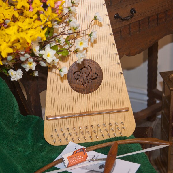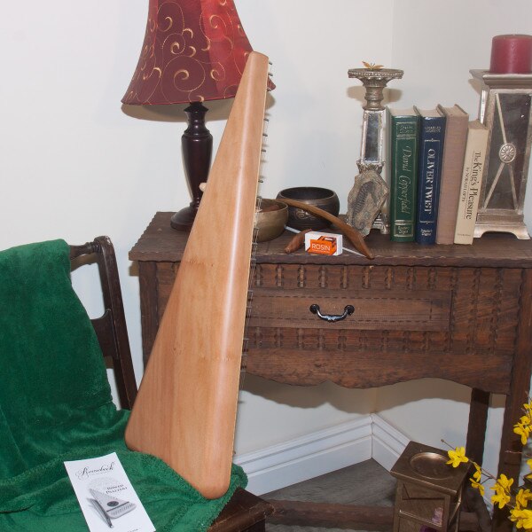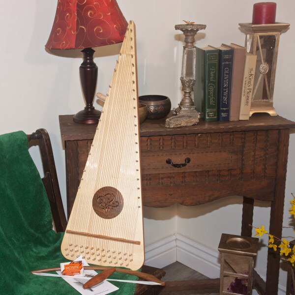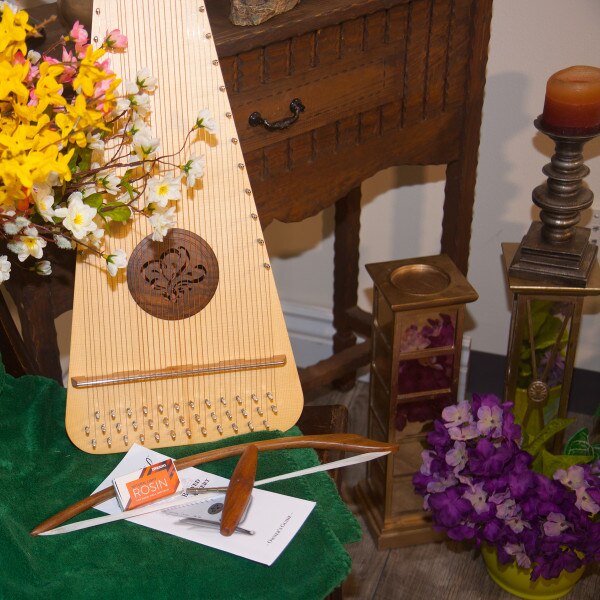 This right-handed rounded psaltery has 37 strings, ranging C3 - C6. Constructed with a spruce soundboard on a body of lacewood. The single sound hole features an intricately carved sheesham rosette. It ships with a psaltery bow, tuning tool and rosin.