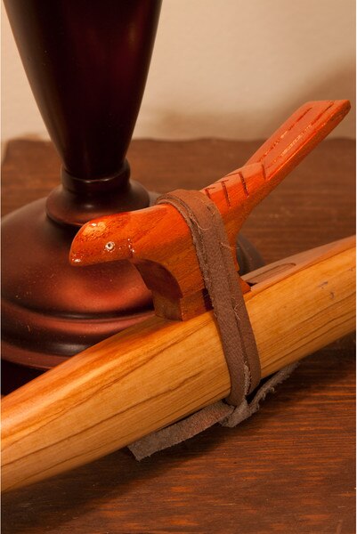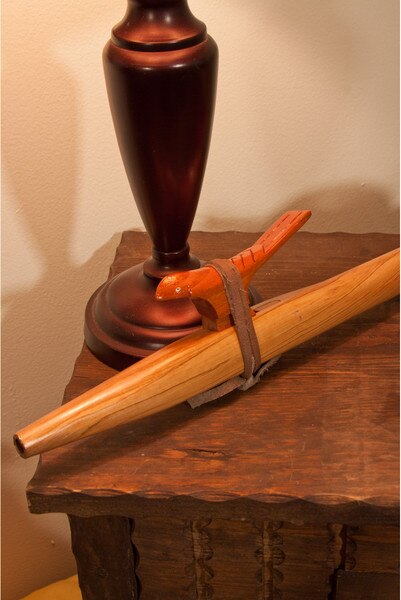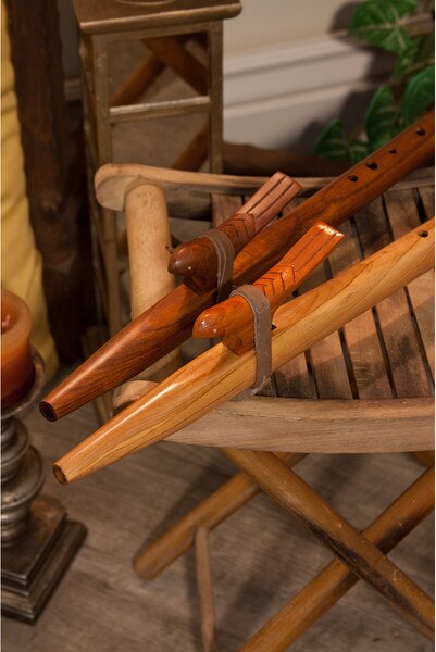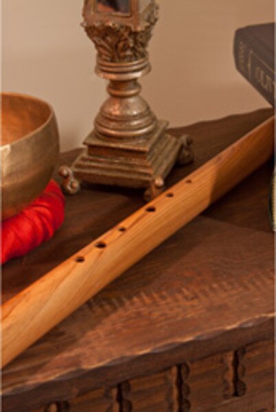 Native American Style Flute, Satinwood ( Item Code: NAFLC) This Native American Style flute is end blown with six finger holes. It is composed of two parts; the pipe body and the bird or saddle block. Flow is controlled by sliding the bird over the top opening. You may make a minor adjustment in pitch by moving the bird forward (sharpening pitch) or backward (flattening pitch). Make sure not to close off the opening completely. The Color of the wood varies. They are not made to be concert tuned. They are made to be in tune with themselves. The music of the Native American Style Flute is meant to be inspirational and personal. They have a lovely, open ethereal, sound. The lowest note is the F# and is played with all holes covered.