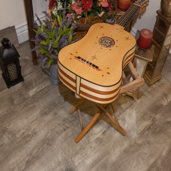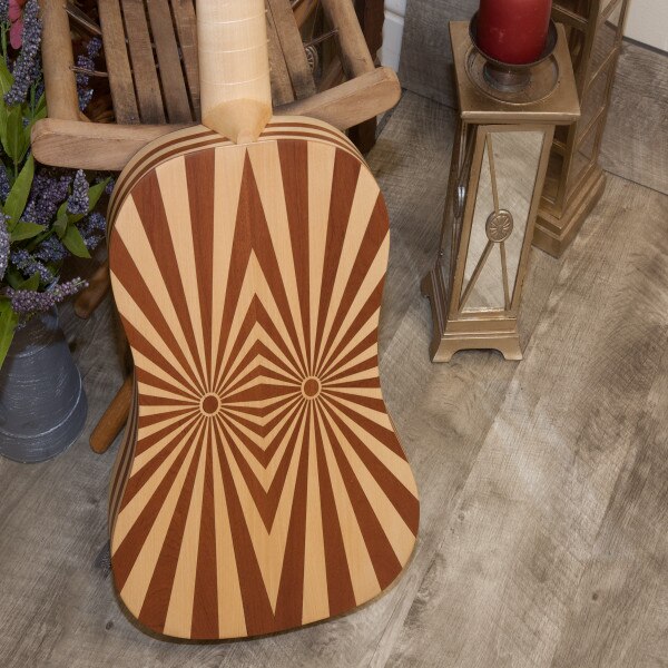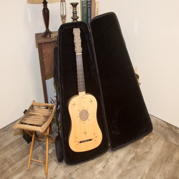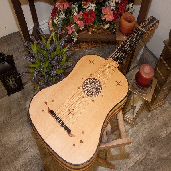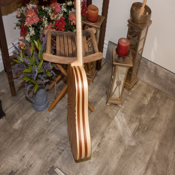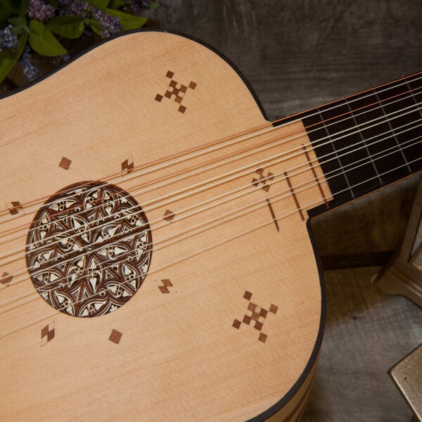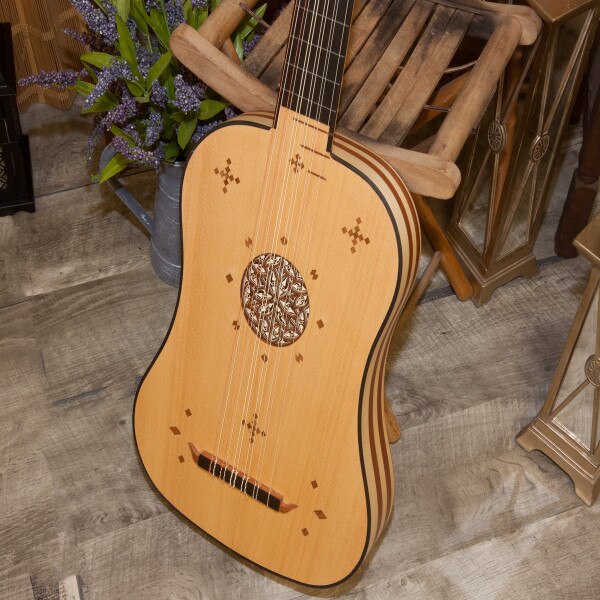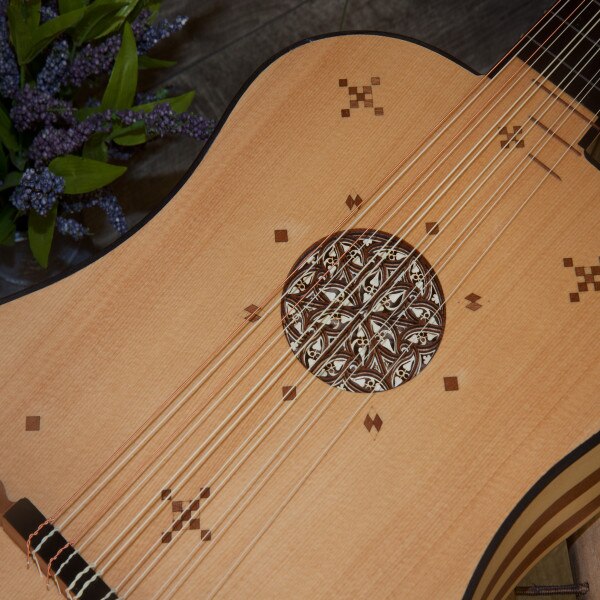 The body is made with alternating staves of maple & mahogany on sides & back in a matte finish. The soundboard is spruce. The neck is maple with an ebony fingerboard. The frets on the neck are nylon, there are three sheesam frets on the spruce soundboard. The tuning pegs are mahogany. It has six courses, five of which are two strings each, with the first course being a single string (courses 1-4 nylgut and courses 5-6 nylgut & phosphor bronze wound). The bridge has a mahogany base with an ebony top; the ornate mahogany mustache stands out against the light spruce soundboard. It has one sound hole in the center of the soundboard, which is exceptionally ornate, a 4-layer deep parchment style rosette.