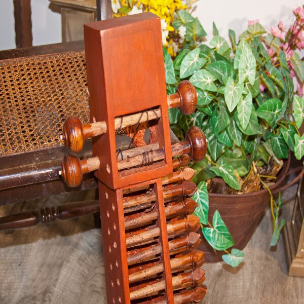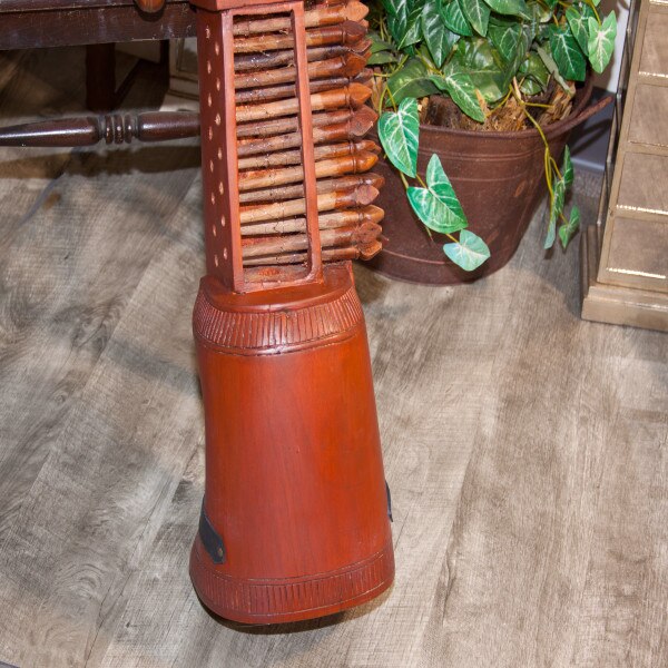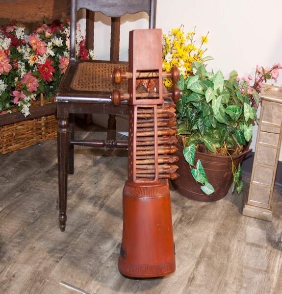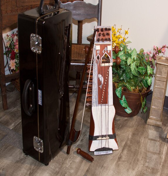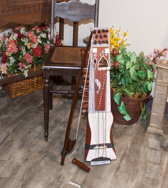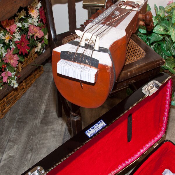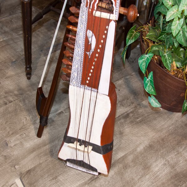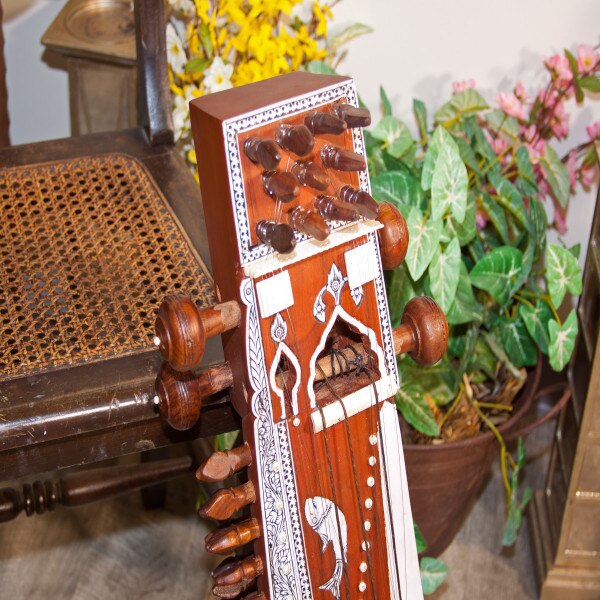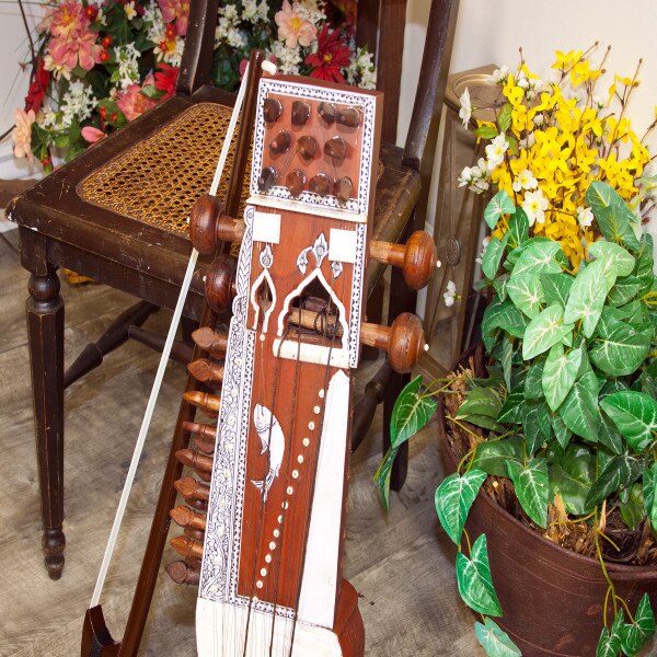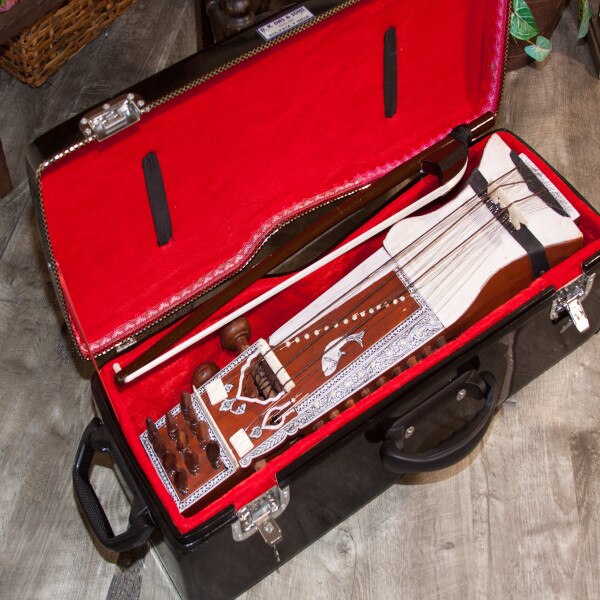 This Sarangi is carved from one piece of toon wood in India. It is 27 inches long with 3 gut main strings which are bowed & 35 steel sympathic strings. The bone bridge sits atop a goat skin to produce a unique sound. It is decorated with fish inlays & has a semi glass finish. It includes bow, fiberglass case, tuning tool.