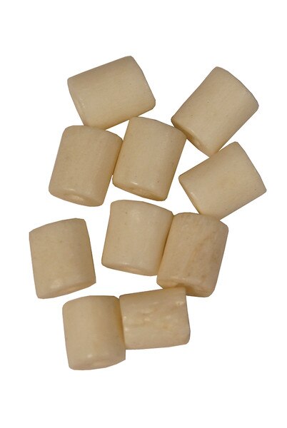 Large cattle-bone eyelets used as grommets in the sitar neck. The sympathetic strings run from the tuning pegs through the neck of the sitar and pass through these eyelets before running the length of the neck. These are known as taraf mogara. They are traditionally made of cattle-bone and are glued into holes on the front plate of the neck. They serve to keep the strings from biting into the wood front plate of the neck. Large size, approximately 3/16 inch in diameter by 1/4 inch long.